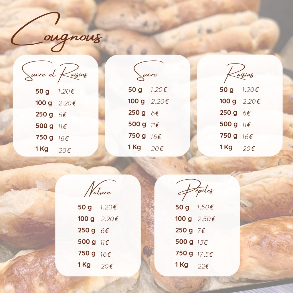 De début novembre jusqu’à l’Épiphanie, nous vous proposons également nos cougnous (nature, sucre, sucre/raisins, raisins sans sucre, pépites de chocolat).