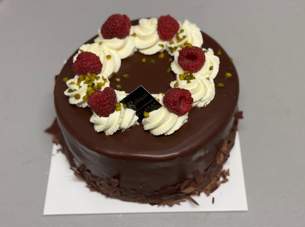 Génoise légère, garnie de crème fraîche fouettée et de couches de fruits frais, le tout enveloppé d’une ganache au chocolat